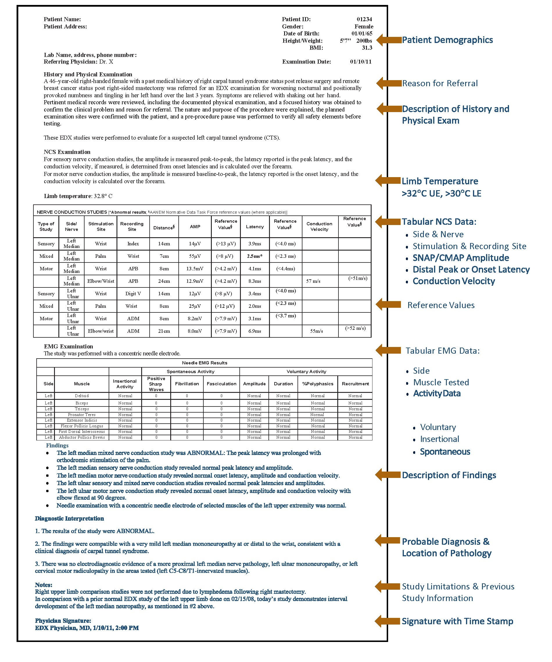 Helping physicians improve the quality of their reports is a key goal for the AANEM. The report template below is based on the AANEM’s educational paper Reporting the Results of Nerve Conduction Studies and Needle EMG. A report template helps the EDX physician adhere to and document required procedures —by checking them off a list. This process will help the EDX physician complete a thorough analysis of the patient’s history, physical, and EDX data that will improve diagnostic accuracy and result in better quality patient care. The template also will help laboratories applying for the laboratory accreditation program meet the criteria used to evaluate EDX reports. The template was developed listing the key elements for an EDX standard report excluding F-wave, H-reflex, and repetitive stimulation studies. Physicians are strongly urged to utilize this template to improve their reports.